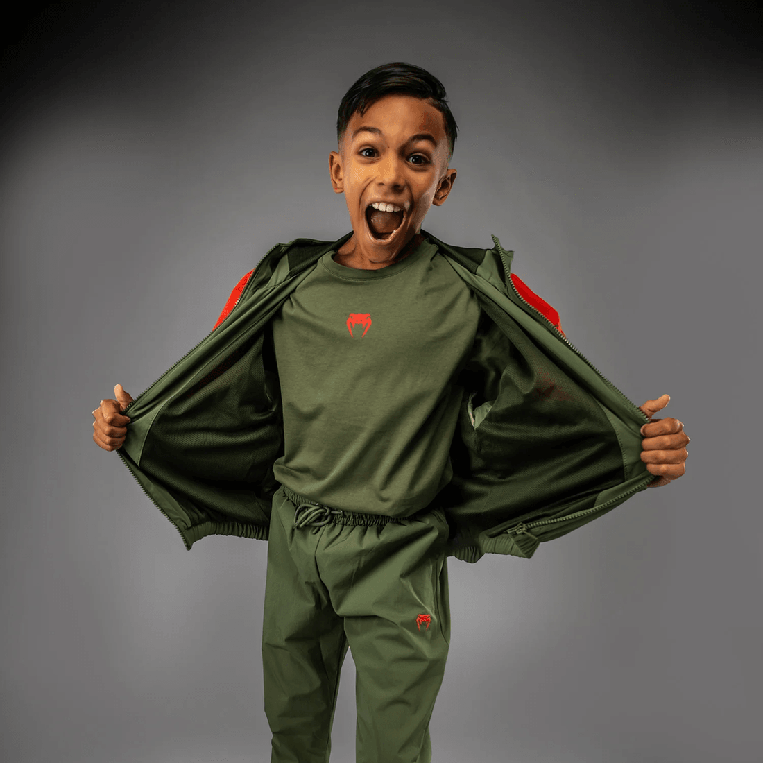 نقدم لكم سترة فينوم فيكترا للأطفال باللون الأخضر العسكري/البرتقالي، حيث يلتقي الأداء بالأناقة! تم تصميم هذه السترة للرياضيين الشباب الذين يتوقون للراحة والوظائف سواء داخل الصالة الرياضية أو خارجها.