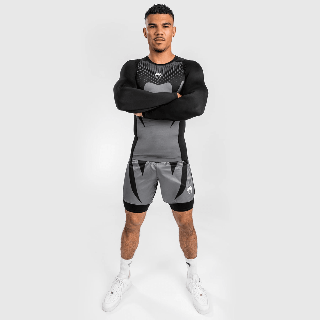 løft Din Træning Med venum Attack Herres Langærmet Rashguard I Slankt Sort Og Grå. Designet Til Mma, Bjj Og Forskellige Kampsportsgrene, Tilbyder Denne Rashguard Uovertruffen Beskyttelse Og Ydeevne, Hvilket Gør Hvert Slag Betydningsfuldt.