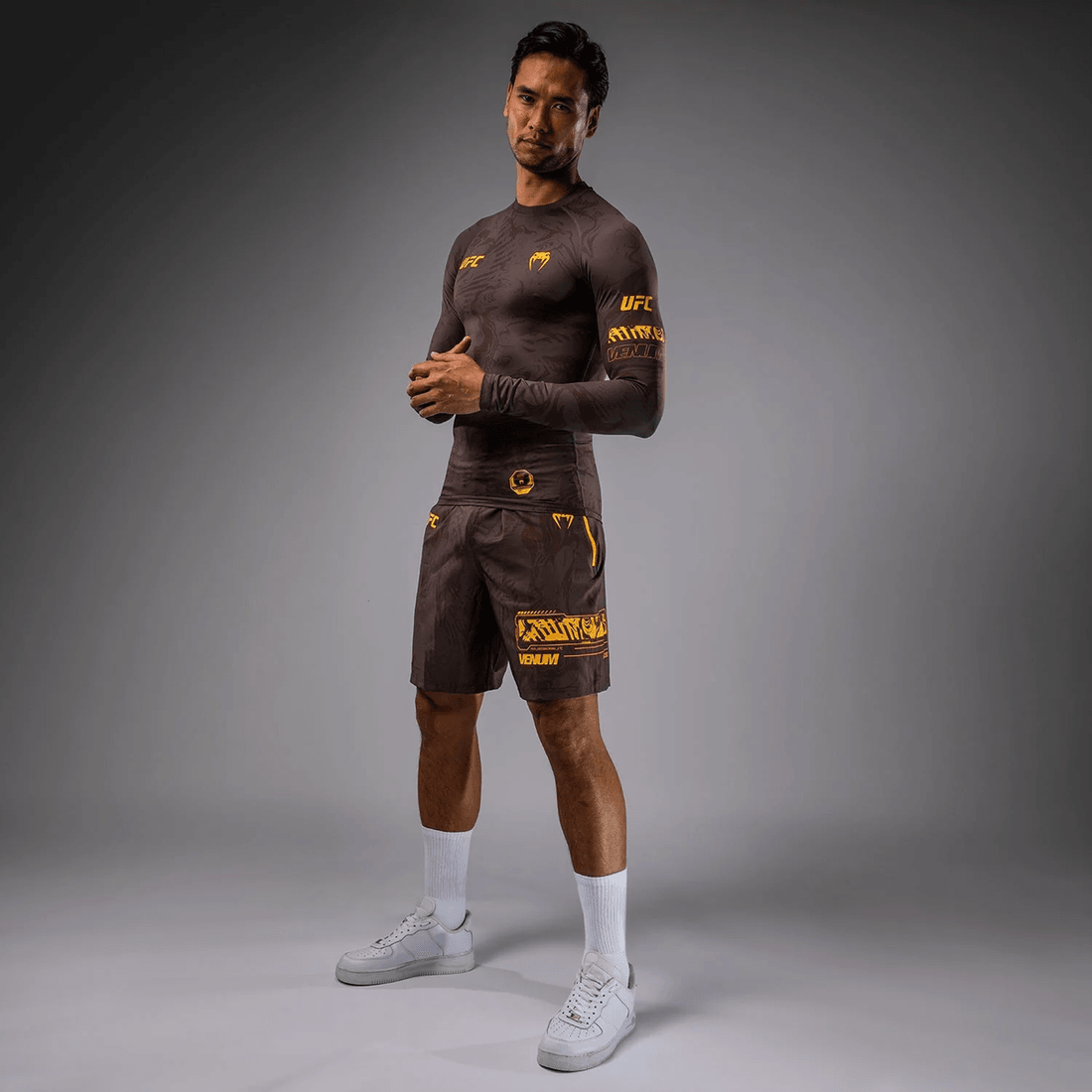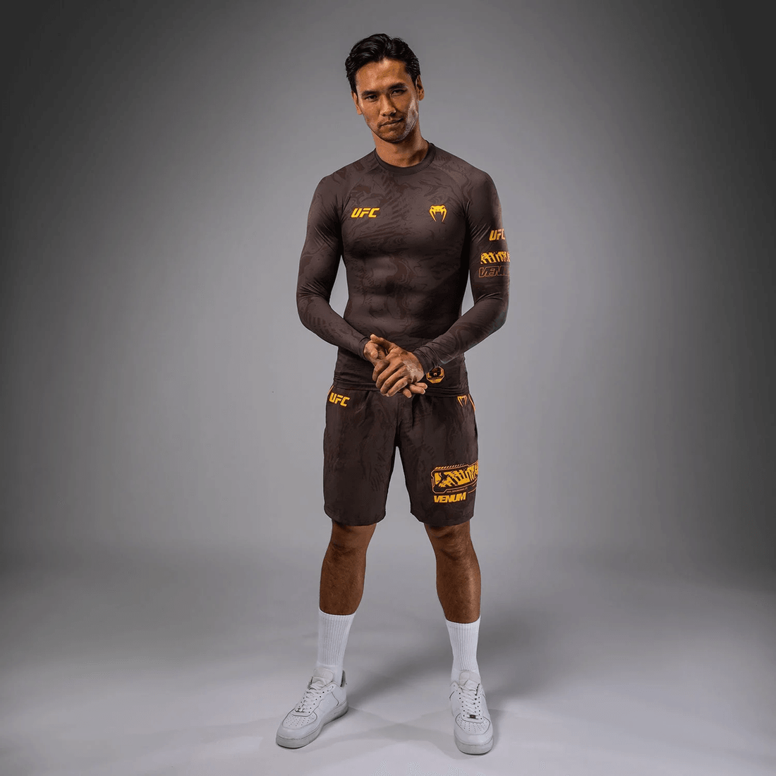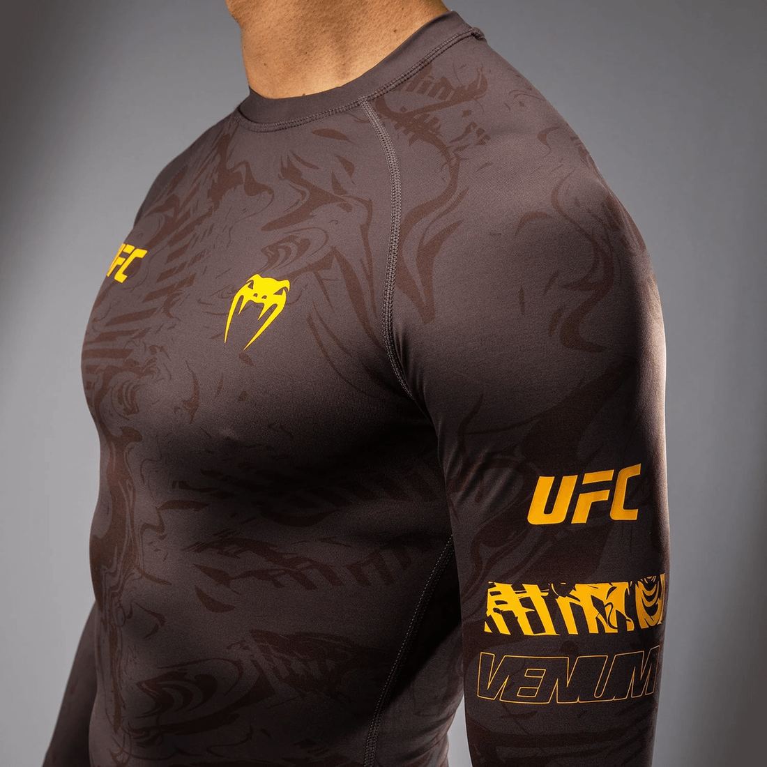 libérez Vos Instincts Primitifs Avec Le ufc Fusion Par Venum Semaine De Combat T-shirt à Manches Longues Performance Pour Hommes En Brun Terre. Ce T-shirt De Haut Niveau Combine Des Tissus De Performance à La Pointe De La Technologie Avec Un Design Frappant Qui Incarne L'énergie Brute De La Nature. Parfait Pour Les Athlètes De L'ufc, Il Est Conçu Pour Exceller à La Fois Dans La Salle D'entraînement Et Lors De La Nuit De Combat.