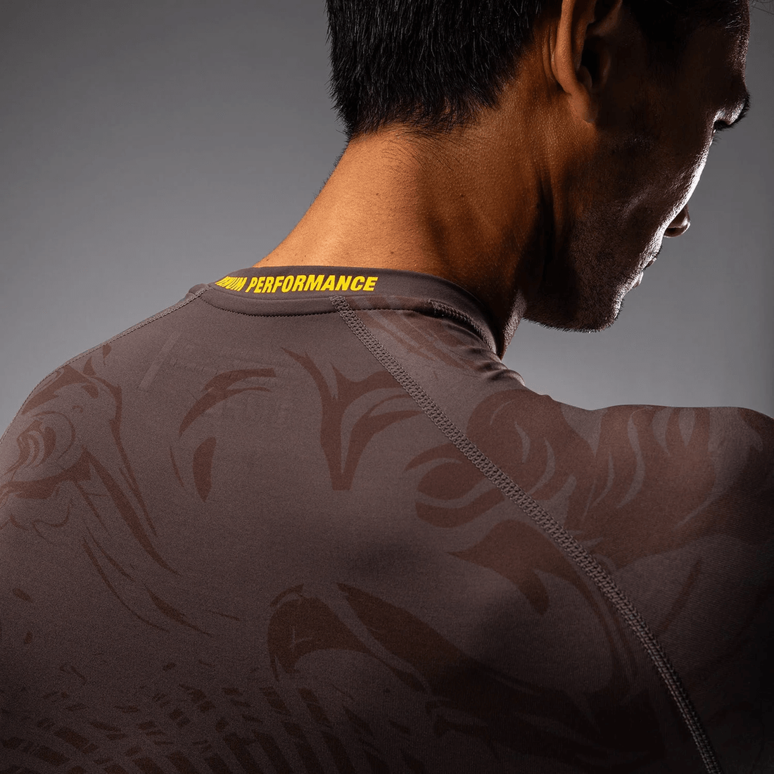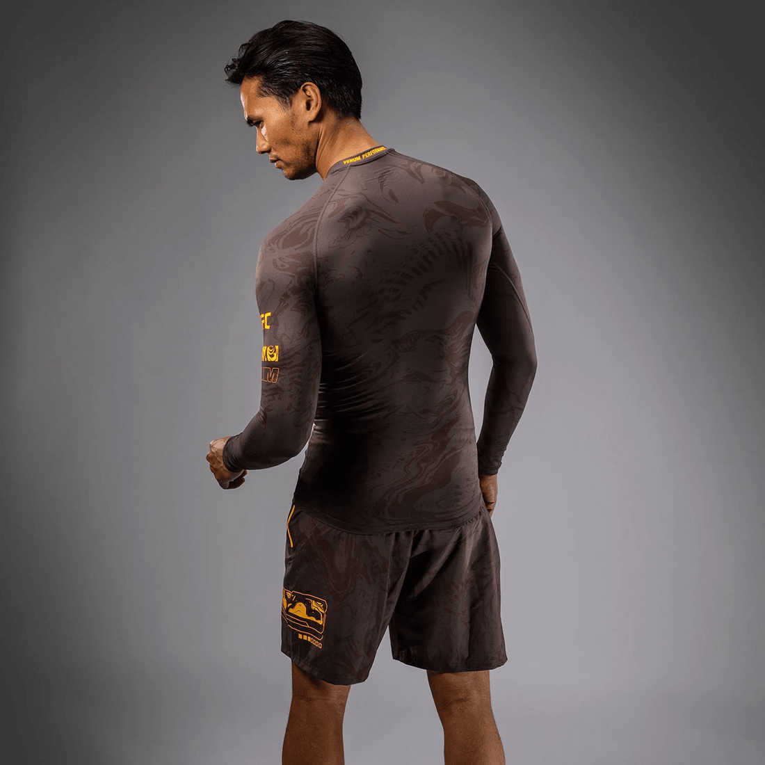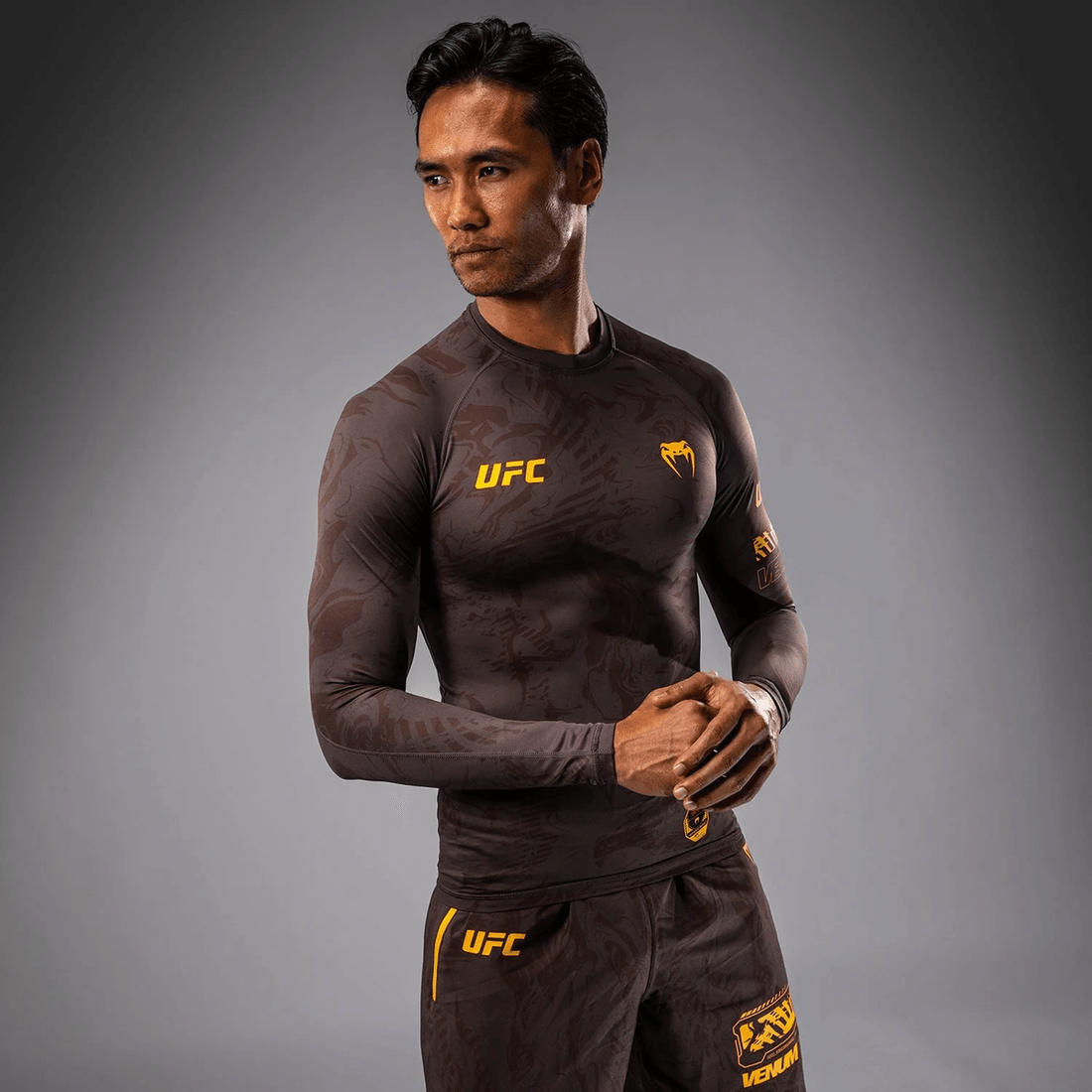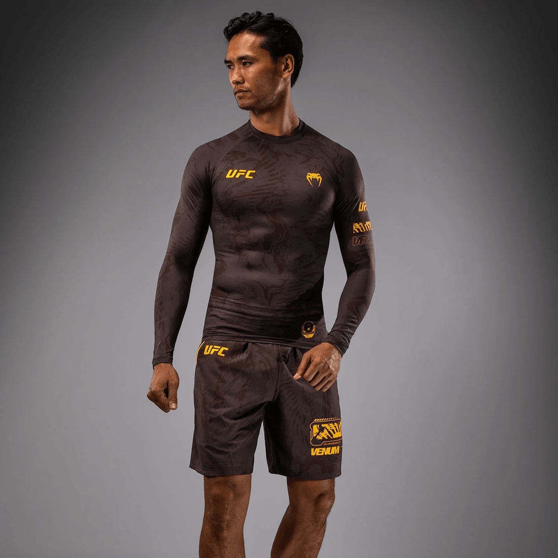 libérez Vos Instincts Primitifs Avec Le ufc Fusion Par Venum Semaine De Combat T-shirt à Manches Longues Performance Pour Hommes En Brun Terre. Ce T-shirt De Haut Niveau Combine Des Tissus De Performance à La Pointe De La Technologie Avec Un Design Frappant Qui Incarne L'énergie Brute De La Nature. Parfait Pour Les Athlètes De L'ufc, Il Est Conçu Pour Exceller à La Fois Dans La Salle D'entraînement Et Lors De La Nuit De Combat.