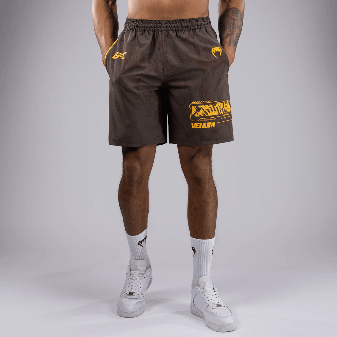 presentiamo I pantaloni Da Performance Per Uomini Ufc Fusion By Venum Fight Week - Marrone Terra, Dove Prestazioni All'avanguardia Incontrano Un Design Primordiale. Realizzati Per L'atleta Dedicato, Questi Pantaloni Sono Il Tuo Compagno Di Allenamento Perfetto, Sia Che Tu Stia Andando In Palestra O Preparando Per La Notte Del Combattimento.