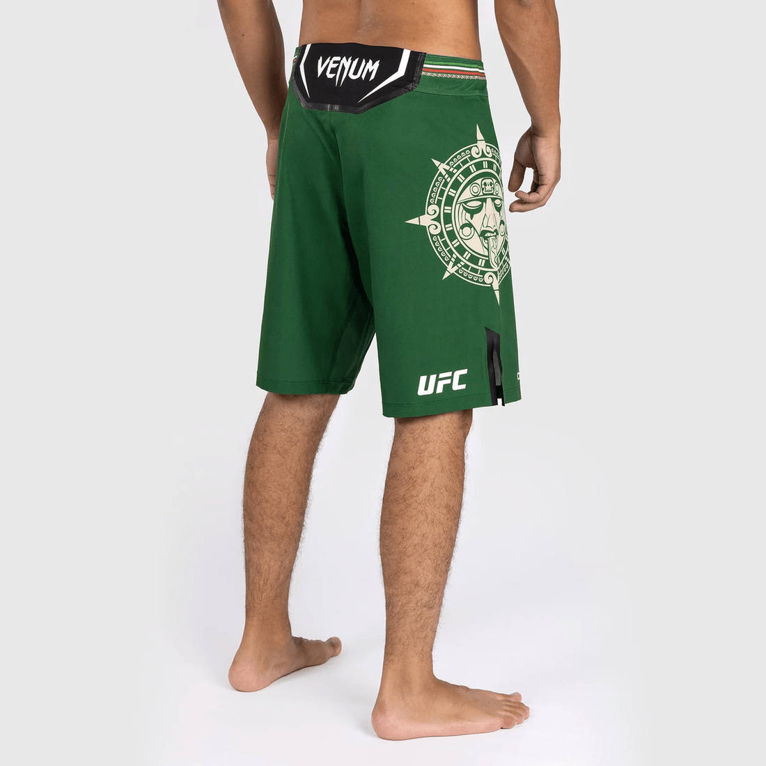 de noche Ufc By Venum Authentieke Fight Night Heren Fight Short - Lange Pasvorm - Groen Heeft Een Opvallende Zonnensteen Grafiek, Die Tōnatiuh, De Azteekse God Van Dag En Nacht, Toont. Dit Unieke Ontwerp Eert De Mexicaanse Cultuur, Met Kleuren Geïnspireerd Door De Moderne Mexicaanse Vlag—rood, Groen En Zwart—die Nationale Trots Symboliseren.