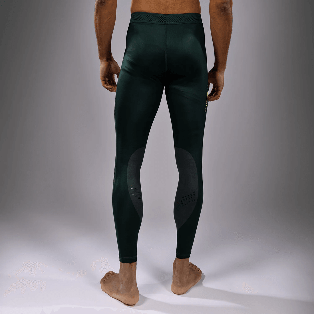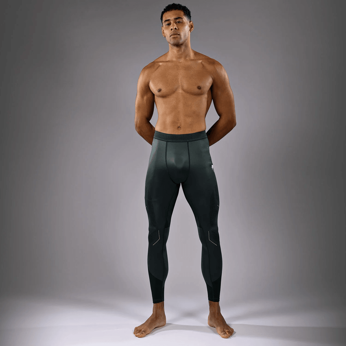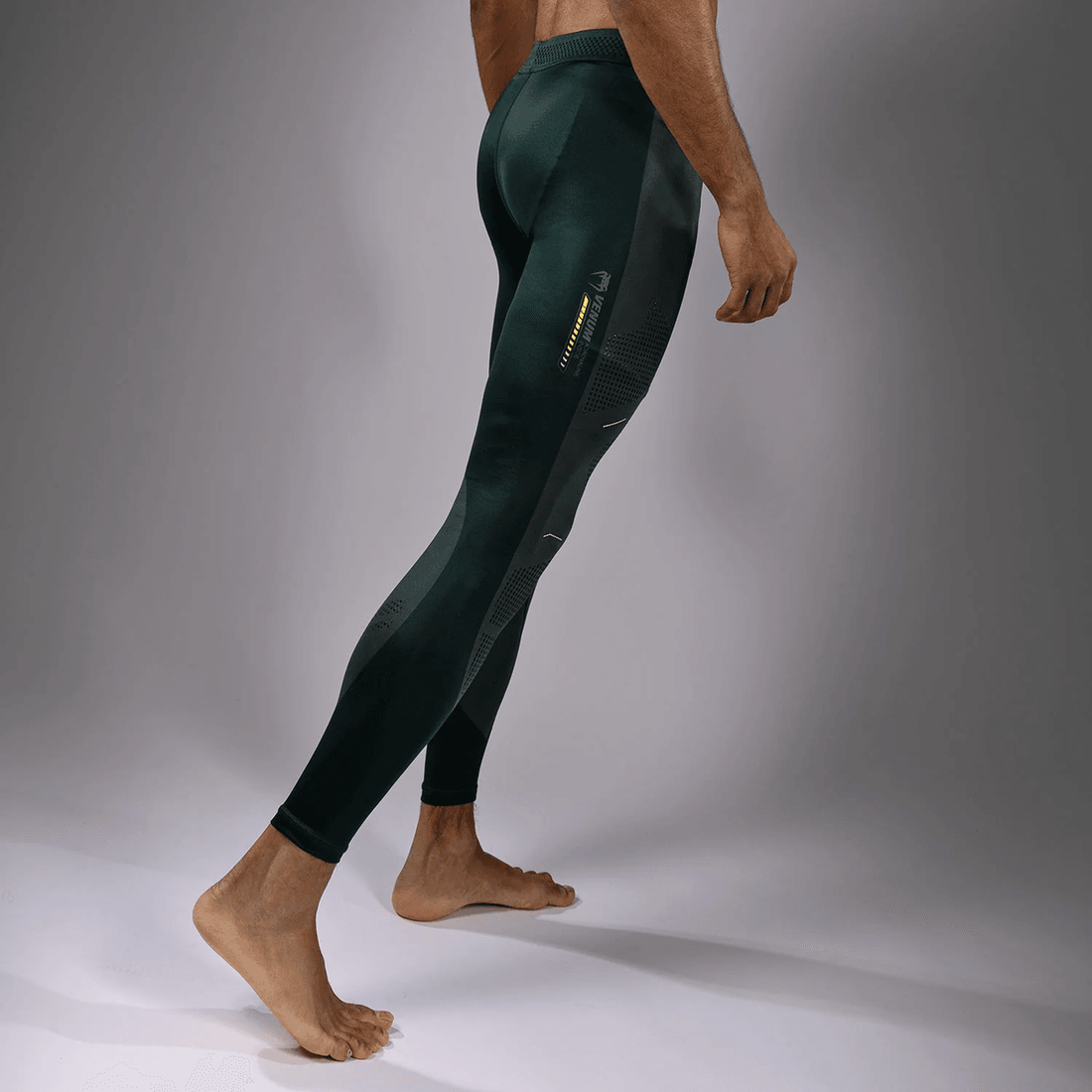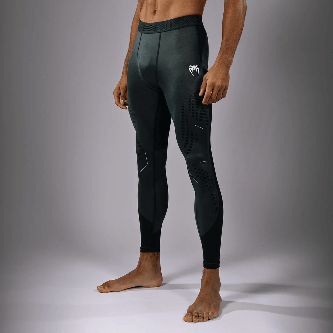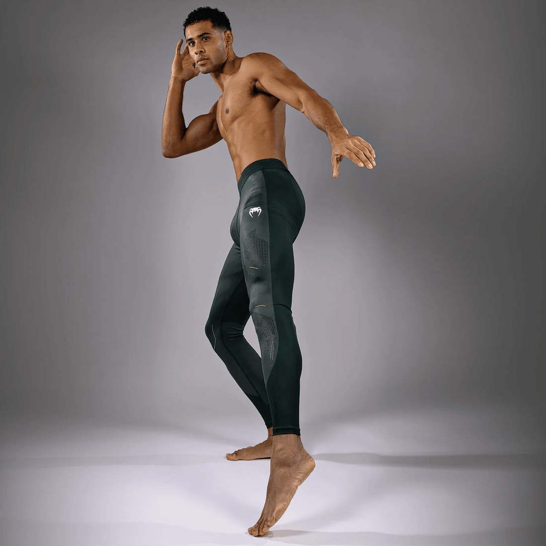 de venum Technical 3.0 Spats - Bosgroen Heeft Een Slank Donkergroen En Zwart Ontwerp, Geaccentueerd Met Het Iconische Venum-logo Op De Heup Voor Een Opvallende Uitstraling Op De Matten Of In De Kooi. Deze Performance Tights Zijn Niet Alleen Esthetisch; Ze Passen Perfect Bij Rashguards Uit Dezelfde Collectie, Waardoor Een Samenhangende Trainingoutfit Ontstaat.