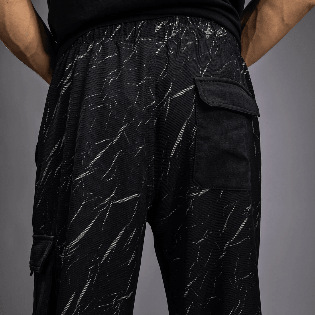 - stijlvolle Cargozakken: Uitgerust Met Zwarte Cargozakken Op De Dij En Achterkant Voor Een Functionele Maar Trendy Uitstraling.
