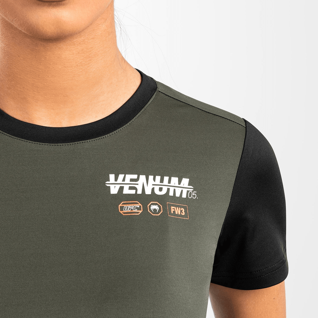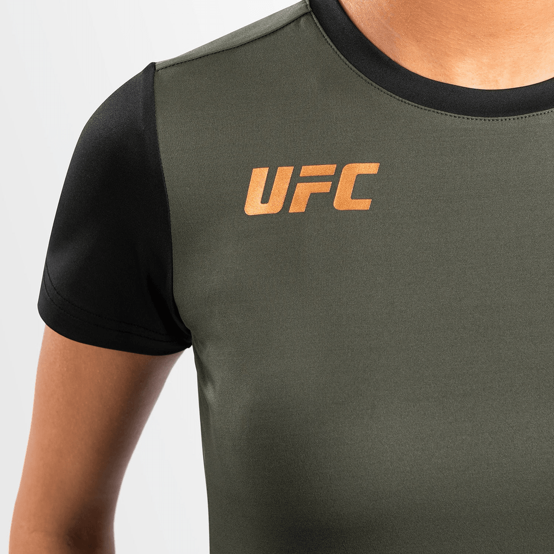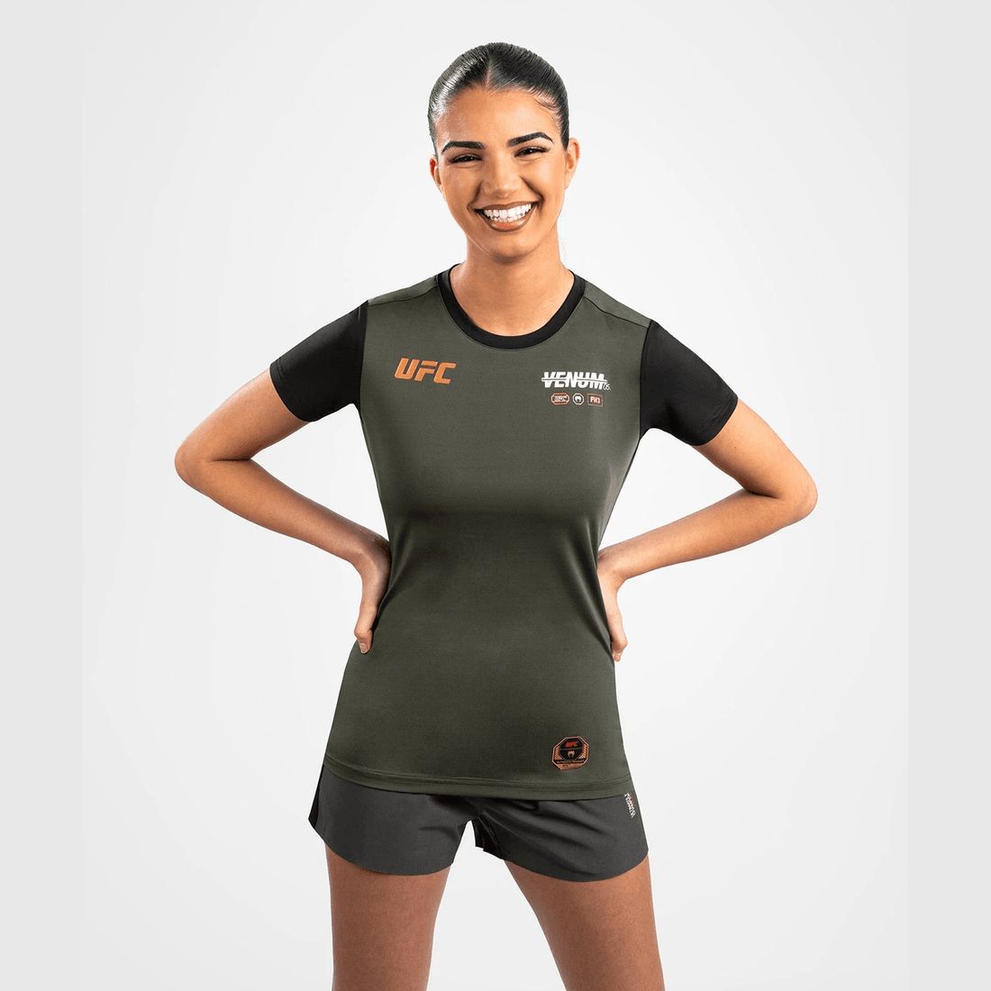 disponível Em Uma Moderna Combinação De Cores Caqui E Bronze, Esta Camiseta Não é Apenas Funcional, Mas Também Fashion. Com Sua Gola Careca Que Valoriza E Ajuste Atlético, Ela Complementa Seu Estilo De Vida Ativo Perfeitamente. Feita Para Mulheres Que Desejam Mostrar Sua Paixão Pelo Ufc E Venum, Esta Camiseta é Um Item Indispensável Para O Seu Guarda-roupa Da Semana De Lutas.