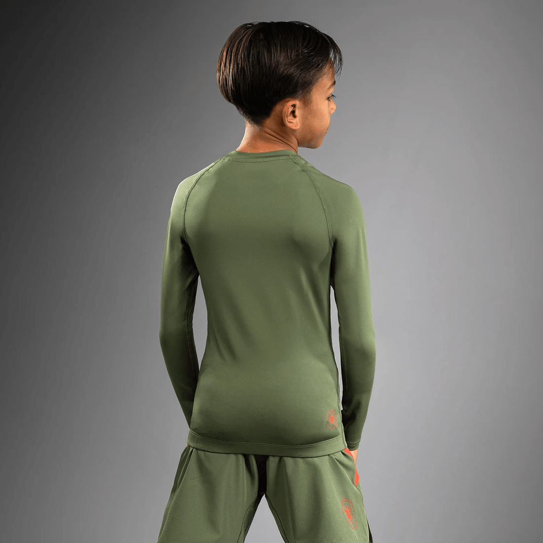 rashguard-urile Cu Mâneci Lungi venum Contender Pentru Copii în Verde Militar/portocalie Sunt Perfecte Pentru Tinerii Luptători. Tehnologia De Compresie Nu Doar Că îmbunătățește Performanța, Dar Promovează și Recuperarea Musculară, Permițând Copilului Să Se Antreneze Mai Intens și Mai Mult. Brâul Din Silicon Asigură Că Rămâne în Poziție, Permițând Mișcări Concentrate Fără Distrageri.