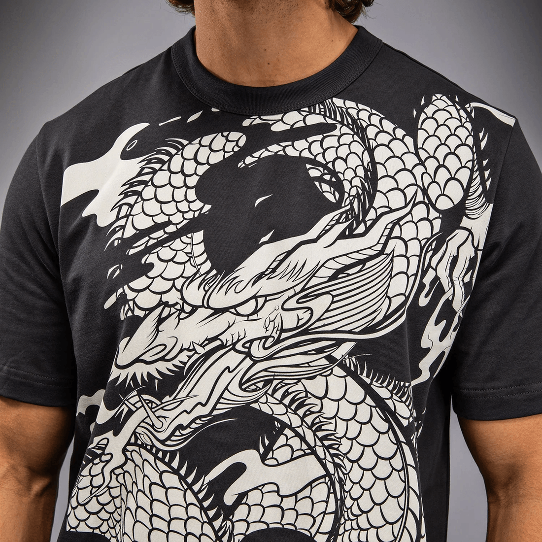 îmbrățișează Spiritul Feroce Al Unui Dragon Cu tricoul Pentru Bărbați Venum Dragon’s Flight în Gri Cărbune și Alb Crem. Acest Tricou Grafic Cu Guler Rotund Prezintă Un Design Uimitor Al Unui Dragon Chinezesc Zburând Prin Cer, Aprins Cu Detalii Foc. Perfect Pentru Oricine Dorește Să Facă O Declarație îndrăzneață în Timp Ce Se Bucură De Confort Superior.