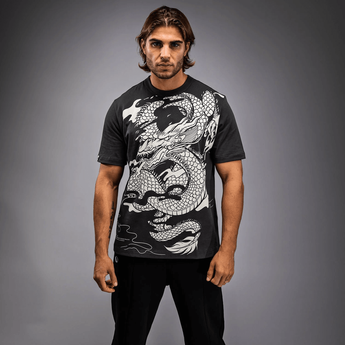 tricoul venum Dragon’s Flight Pentru Bărbați îmbină Stilul Cu Funcționalitatea. Fabricat Din Materiale De înaltă Calitate, Acest Tricou Asigură Respirabilitate și Confort în Timpul Antrenamentelor Sau Ieșirilor Casuale. țesătura Gri Cărbune Contrastează Frumos Cu Designul Cremos Al Dragonului, Făcându-l O Piesă Deosebită în Orice Garderobă.