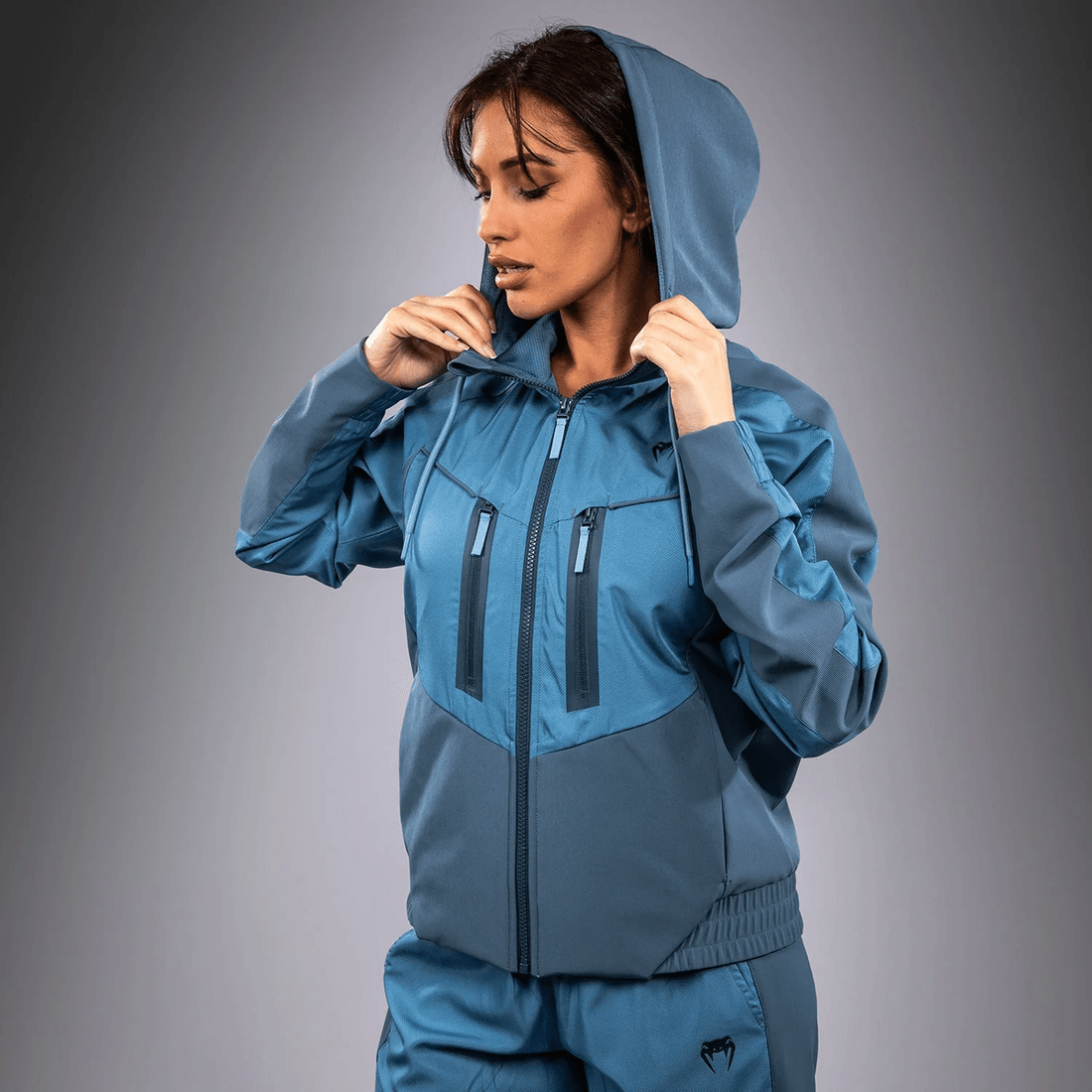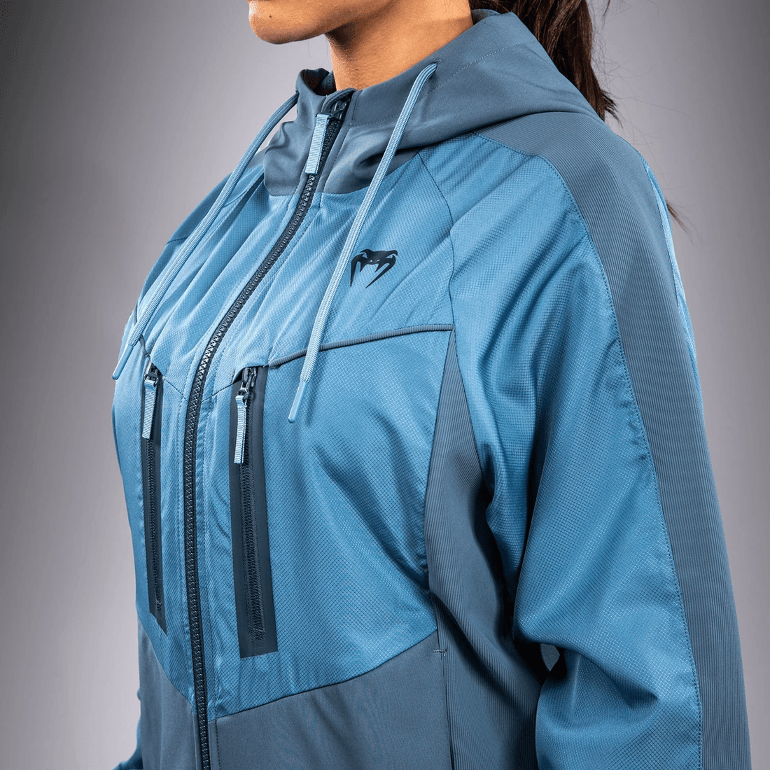 jacheta Venum Women Laser 3.0 - Albastru Are Un Design Striking Cu Fermoar Complet, Completat De O Glugă Cu șnur, Făcând-o Perfectă Pentru Zilele Răcoroase. Culoarea Albastru Pacific Adaugă Un Strop De Vitalitate Ansamblului Tău Sportiv, în Timp Ce Brandingul Negru Venum De La Piept îi Oferă Un Aspect îndrăzneț.