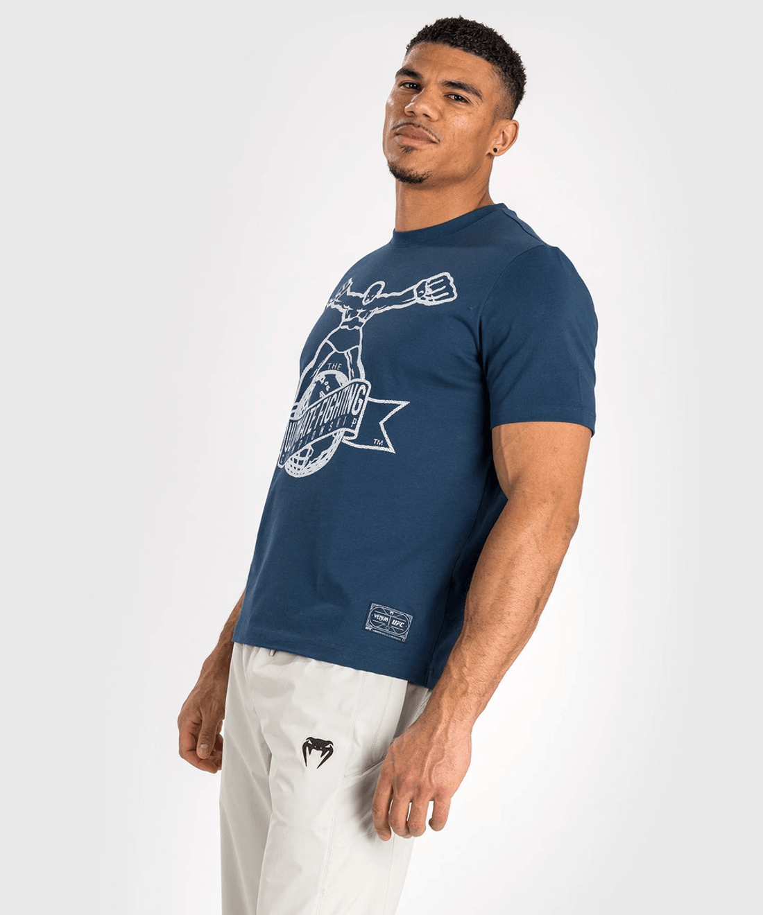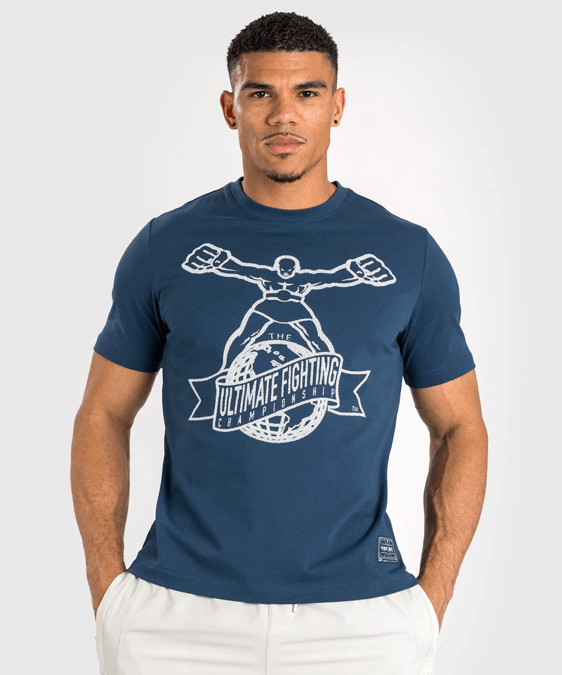 stopite V Ring Z Ikonično ufc By Venum Ulti-man Majico V Mornarsko Modri In Beli Barvi. Ta Majica časti Zgodovino Ufc, Prvotno Predstavljena Na Oktagonskem Platnu Na Ufc 1 Leta 1993. Praznujte Svojo Strast Do Mešanih Borilnih Veščin S Kosom, Ki Združuje Stil In Nostalgijo.