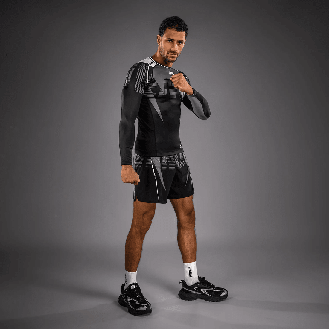 venum Adrenaline Long Sleeve Rashguard Je Vešto Izrađen Za Sportiste Koji Zahtevaju Izdržljivost I Udobnost. Njegov Kompresivni Kroj Pomaže U Smanjenju Umora Mišića I Poboljšava Oporavak, čineći Ga Idealnim Izborom Za Trening I Takmičenja. Prozračna Tkanina Vas Drži Hladnim, Dok Elegantan Crni I Srebrno Sivi Dizajn Osigurava Da Izgledate Odlično Na Strunjači.