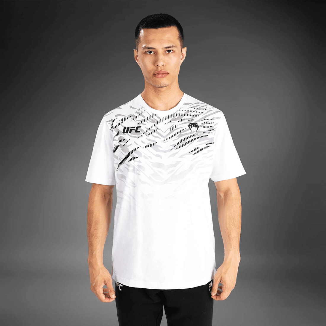 The UFC Fusion by Venum Men’s Replica Short Sleeve T-Shirt - White is crafted for those who live and breathe the UFC lifestyle. This t-shirt not only showcases your passion but also provides unparalleled comfort, making it suitable for workouts, casual outings, or simply lounging at home. The unique animal print design is a bold statement that resonates with the fierce spirit of competition.