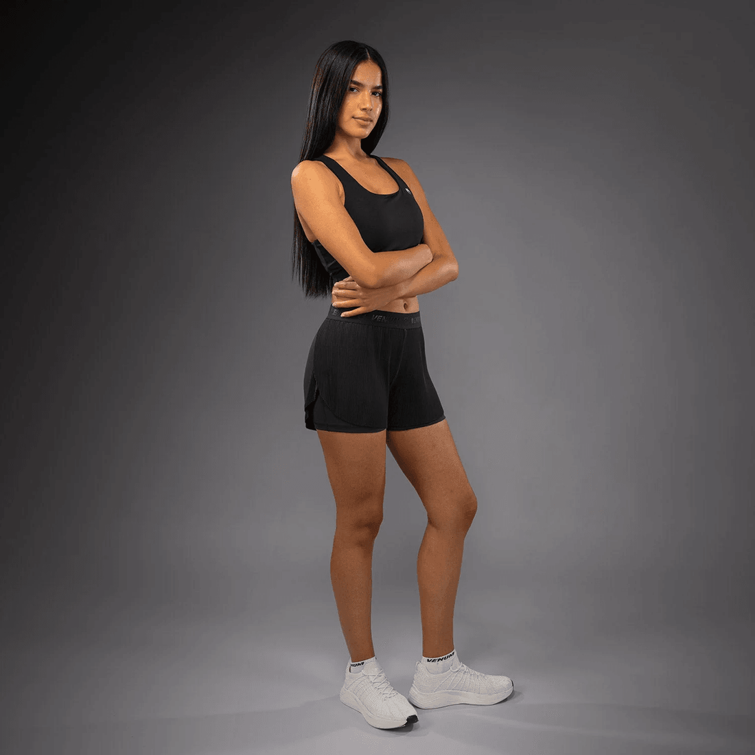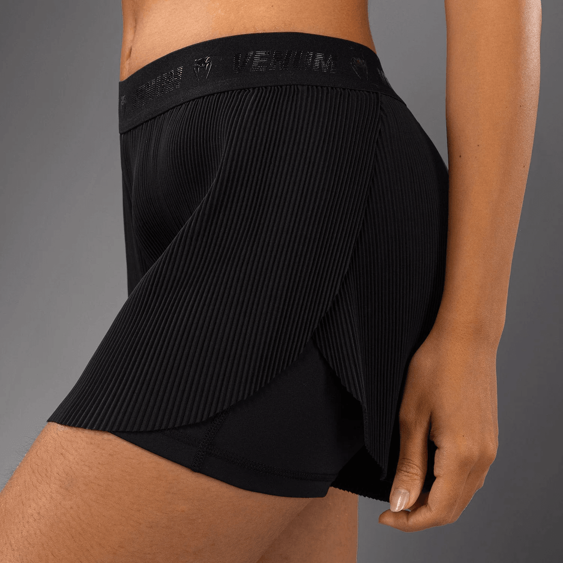The Venum Flowfit Women's Training Shorts - Black are expertly crafted to support your active lifestyle. The inner shorts are made from breathable, stretchy fabric that ensures comfort during high-intensity workouts. The pleated outer short adds a touch of femininity, allowing you to look as good as you feel.