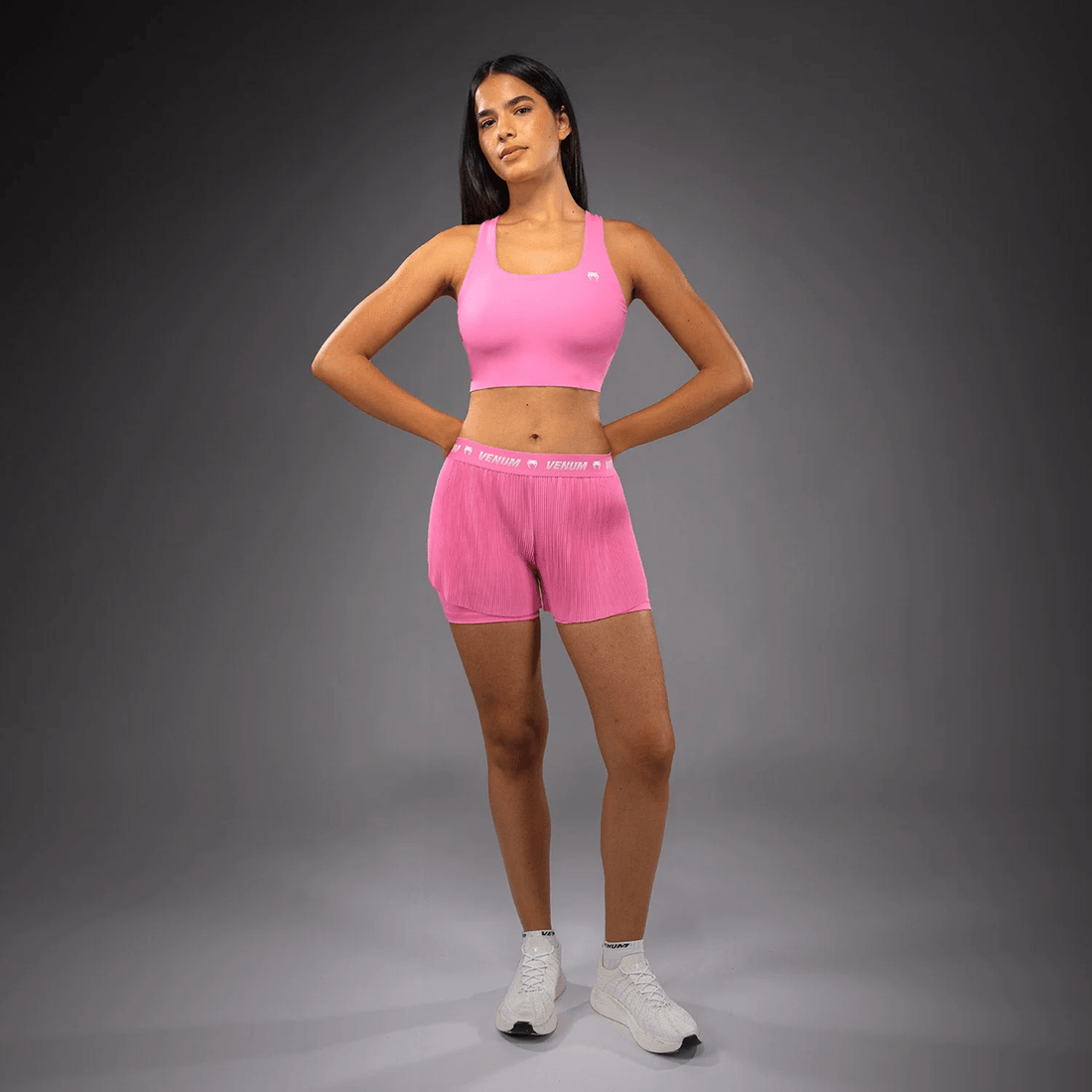 The Venum Flowfit Women's Training Shorts - Candy Pink feature a unique pleated outer short that combines fashion with function. The inner shorts are crafted for ultimate comfort, ensuring you can focus on your performance without distractions. Designed specifically for women who box, these shorts offer the perfect blend of cute and practical.