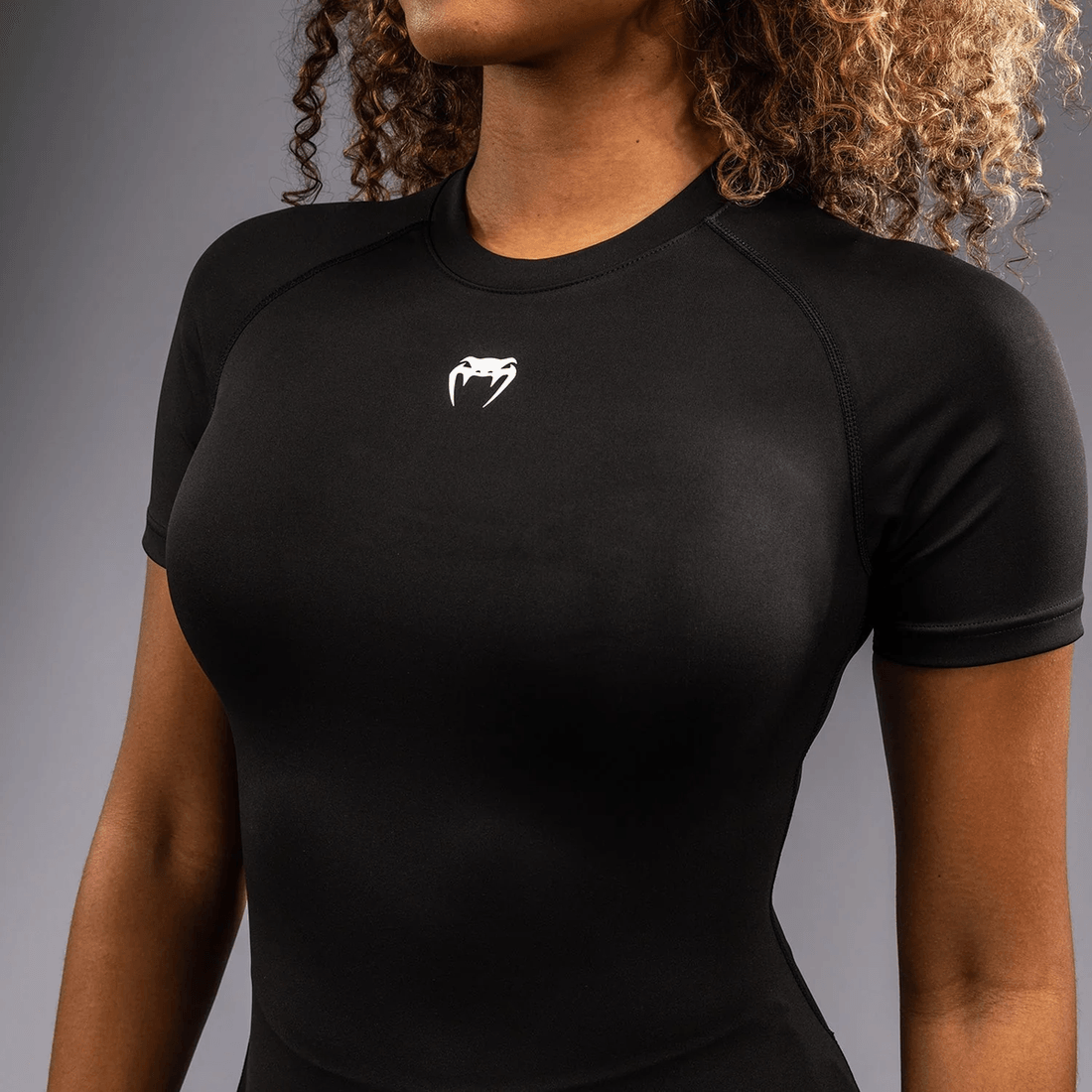 The Venum Halo Women's Rashguard Short Sleeves - Black is crafted with a compressive body fit that not only supports your muscles but also aids in post-workout recovery. The rounded crewneck design ensures comfort and freedom of movement, making it ideal for intense training sessions. With its stylish black finish and prominent Venum logo on the chest, this rashguard is as fashionable as it is functional.