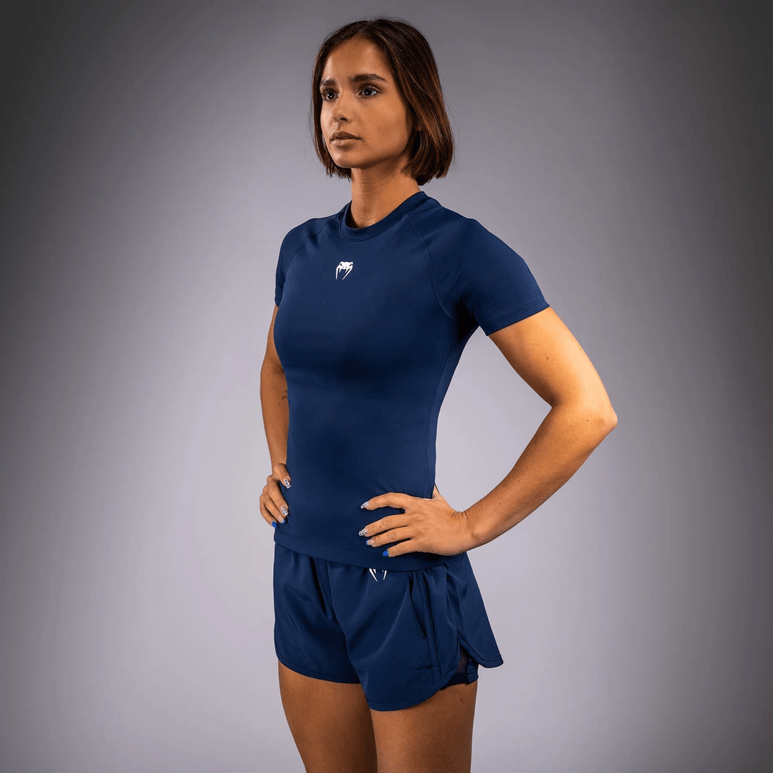 The Venum Halo Women's Rashguard Short Sleeves - Indigo combines style and functionality to help you rise above the competition. Its compressive body fit enhances your performance by providing essential support, while the premium fabric ensures comfort and durability during intense workouts.
