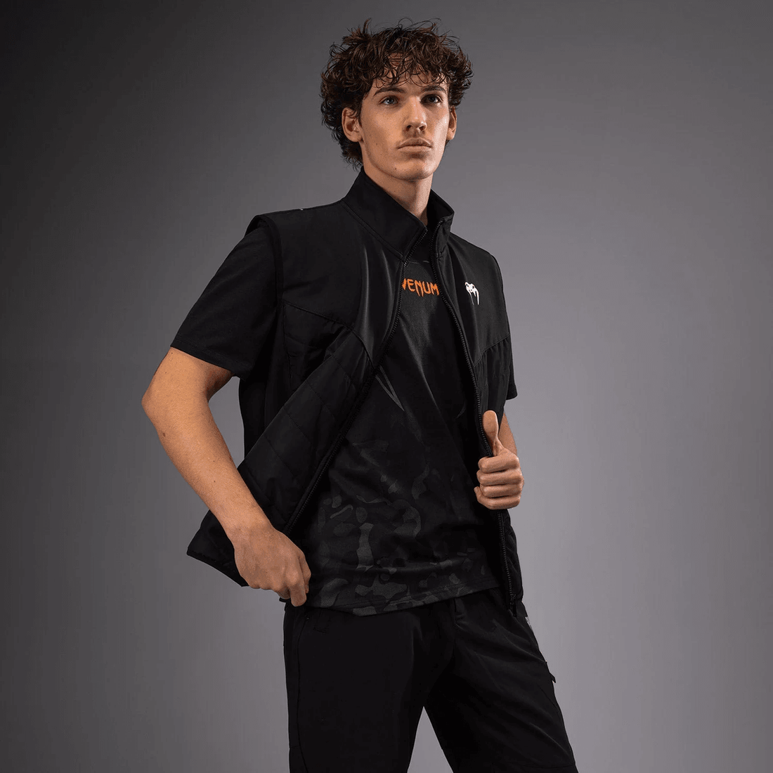The Venum Paddock Softshell Jacket Short Sleeves - Black is a versatile piece that seamlessly transitions from casual outings to high-energy activities. Its sleeveless design allows for optimal movement, making it ideal for layering under other jackets for additional warmth. The windproof technology ensures you stay comfortable, even in breezy conditions.