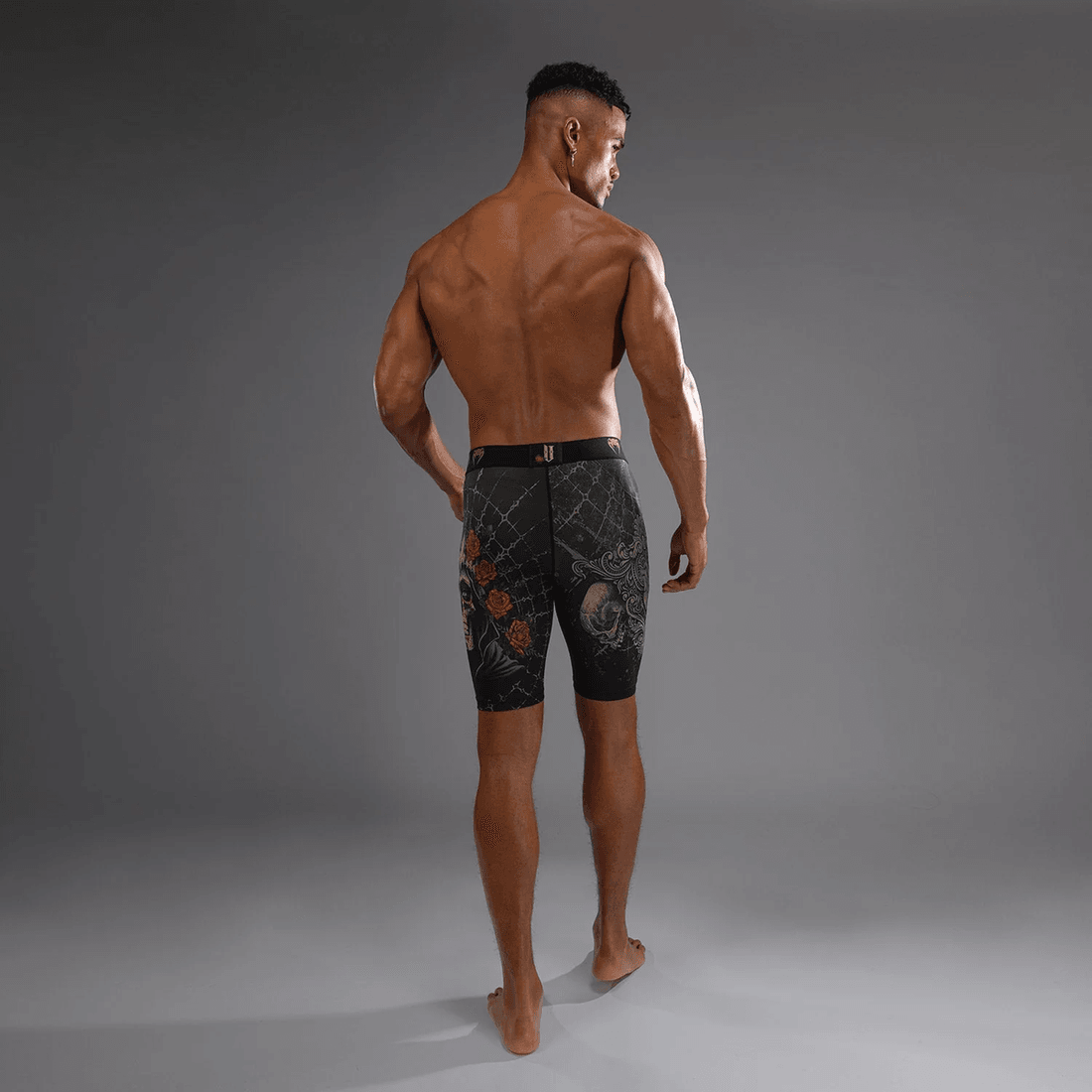 Step up your training game with the Venum Santa Muerte 5.0 Men’s Vale Tudo Shorts. Inspired by Mexico’s revered “Saint of Death”, these shorts are designed for serious athletes who demand both style and performance. With a striking black and gold aesthetic, these mid-thigh length compression shorts are the perfect addition to your combat gear collection.